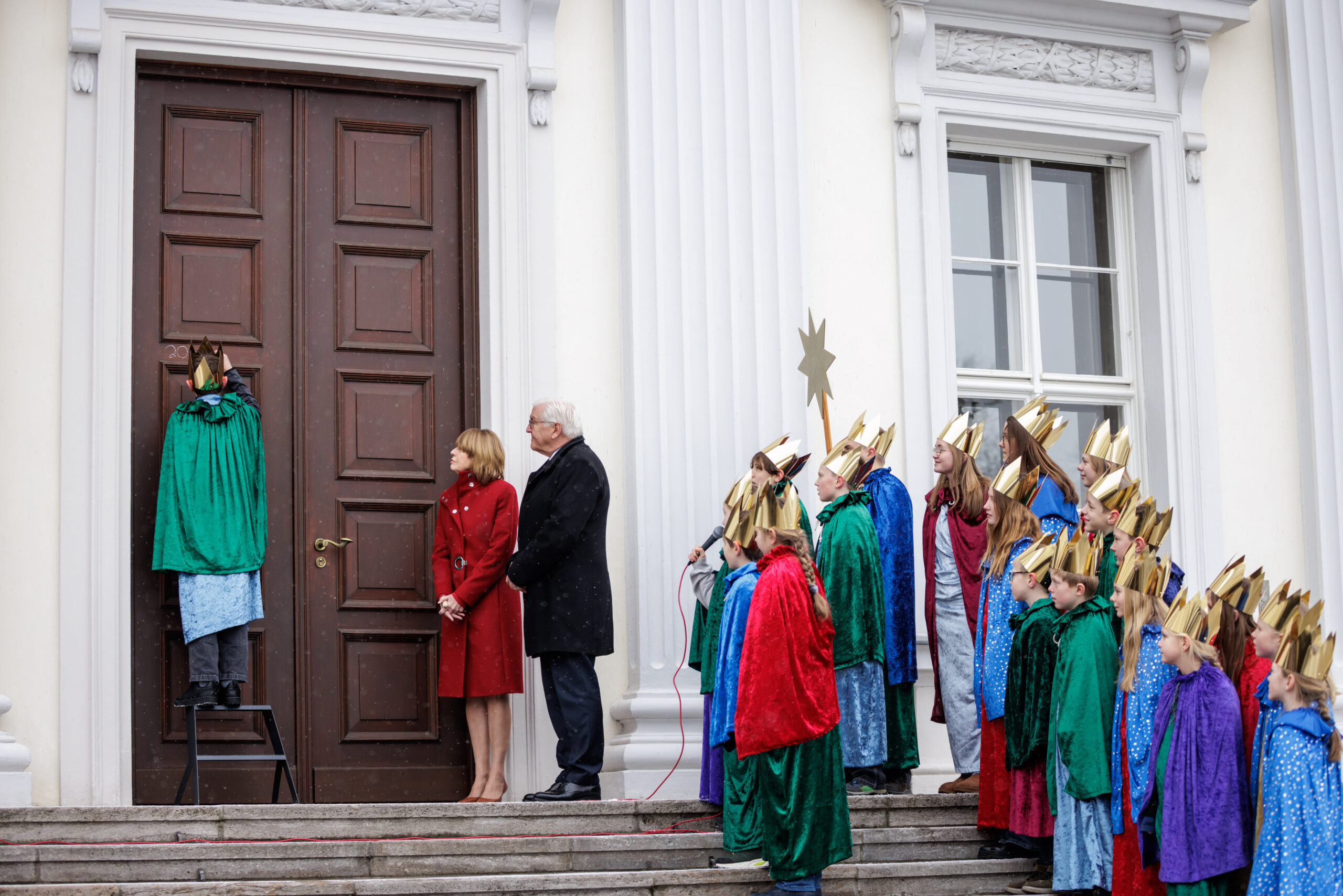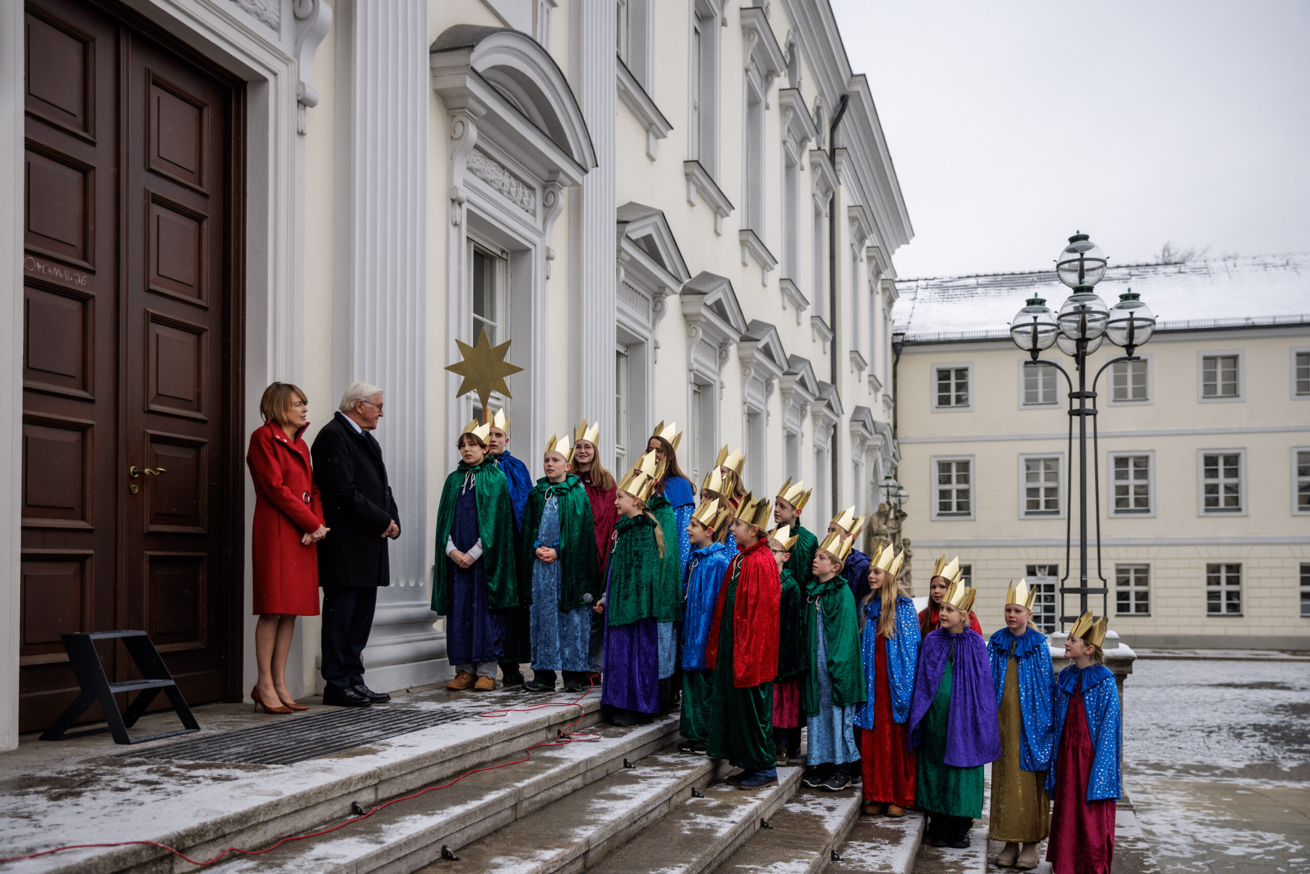 Bundespräsident Frank-Walter Steinmeier und seine Frau Elke Büdenbender, die beide aus dem Erzbistum Paderborn stammen, haben am heutigen Dreikönigstag Sternsingerinnen und Sternsinger im Schloss Bellevue empfangen. Um 11 Uhr schrieben die Königinnen und Könige aus dem Erzbistum Paderborn den Segen „20 * C + M + B + 26 – Christus mansionem benedicat – Christus segne dieses Haus im Jahr 2026“ an das große Portal des Schlosses. Die elf Mädchen und neun Jungen aus der Pfarrei St. Ewaldi in Dortmund-Aplerbeck waren stellvertretend für alle engagierten Königinnen und Könige, die in diesen Tagen deutschlandweit Spenden für benachteiligte und Not leidende Kinder in aller Welt sammeln, nach Berlin gereist.
