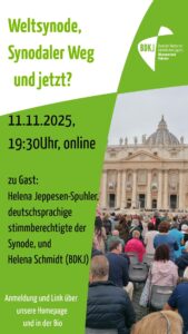 Was steht also im Abschlussdokument, wie ist es nach einem Eklat in der Frauenfrage weitergegangen, wie wird der Synodentext im deutschsprachigen Raum rezipiert und umgesetzt, was macht uns Mut? Damit beschäftigen wir uns am ersten Abend im November.